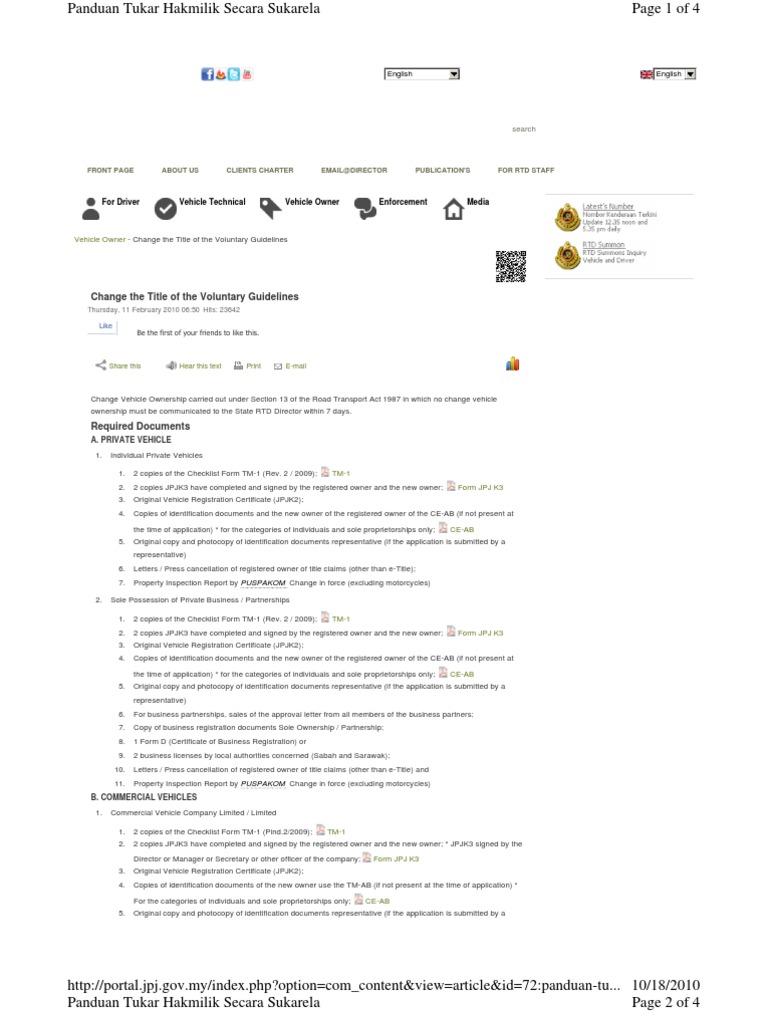 Besides being an initiative to make things more efficient for themselves and owners JPJ said that the Vehicle Ownership Certificate is also an effort to prevent car. A copy of Ownership Grant Checklist. The Road Transport Department JPJ has announced the introduction of an online-based Vehicle Ownership Certificate VOC system which will.